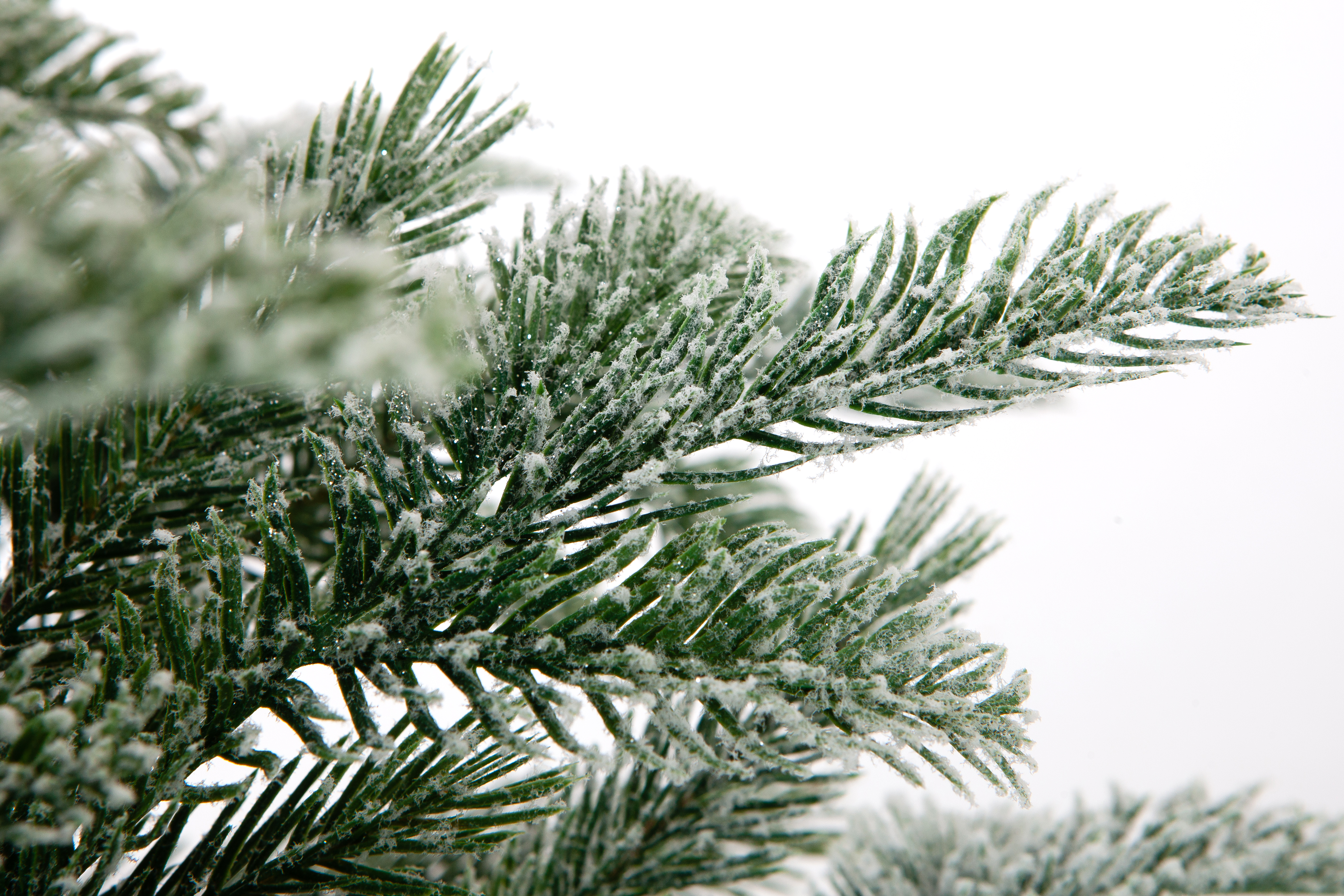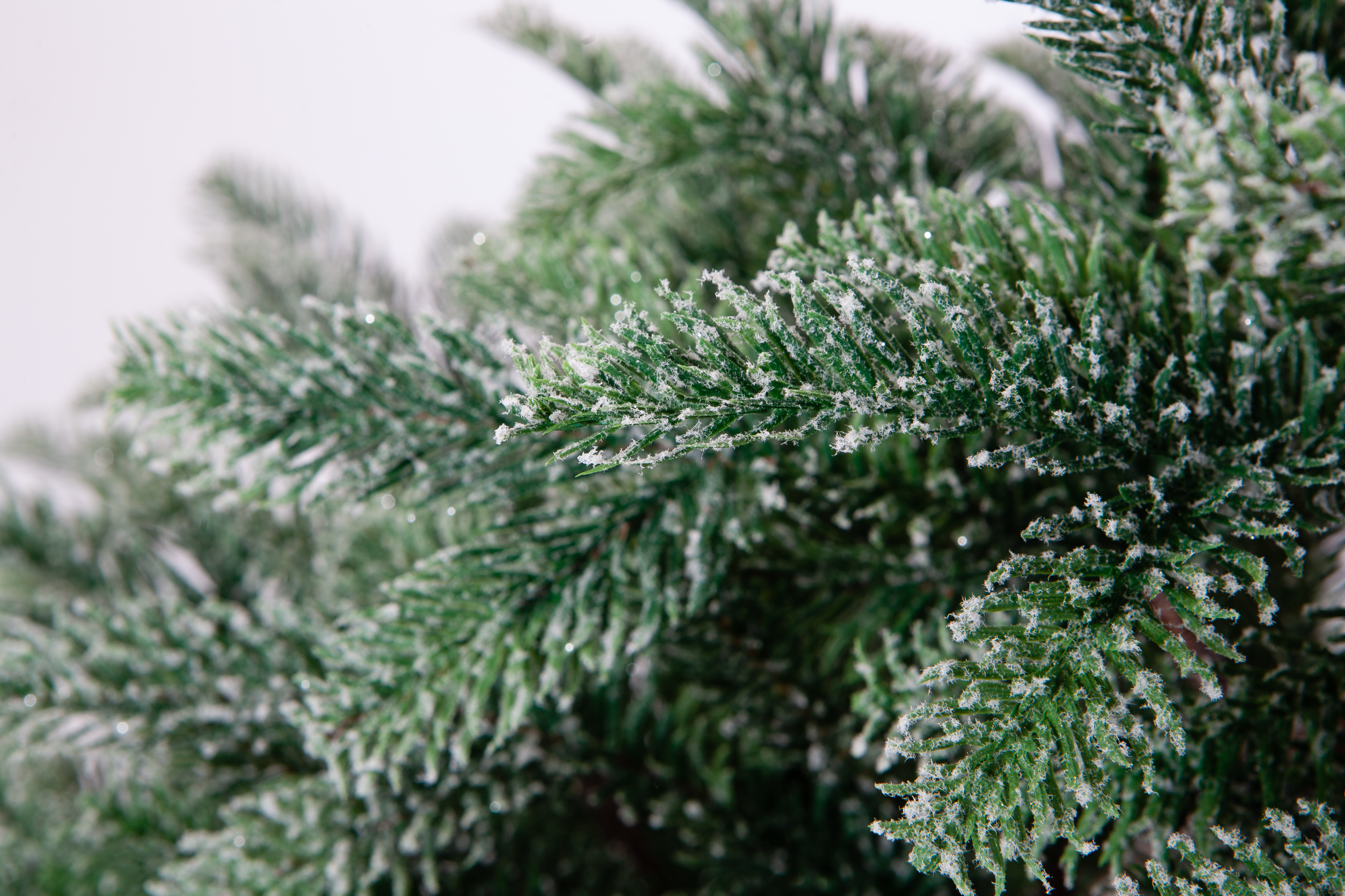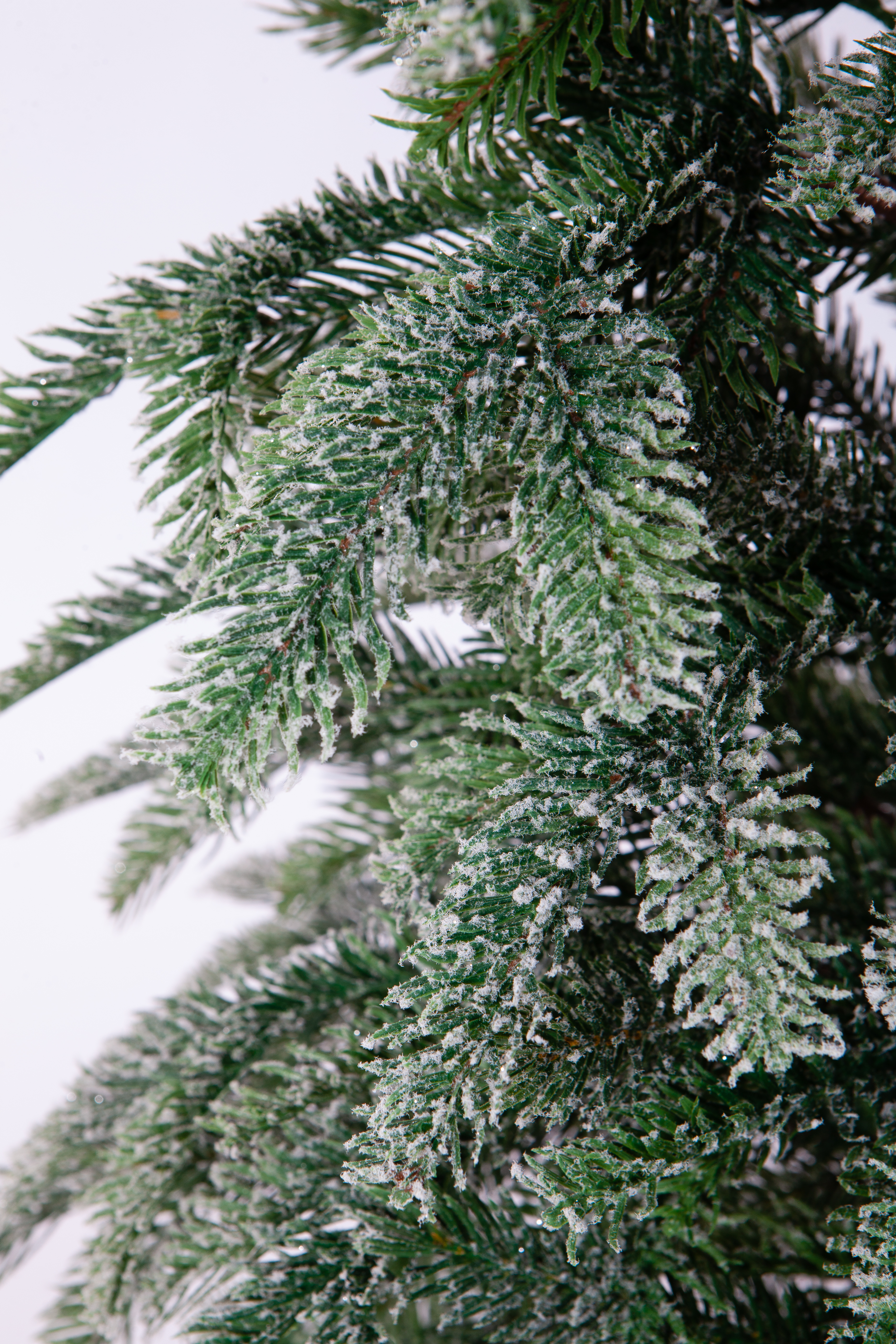 Полностью литые ветки мерцают и переливаются. Снег выглядит будто иней. И нанесен на каждую иголку. Он не осыпается при сборке и распушении.