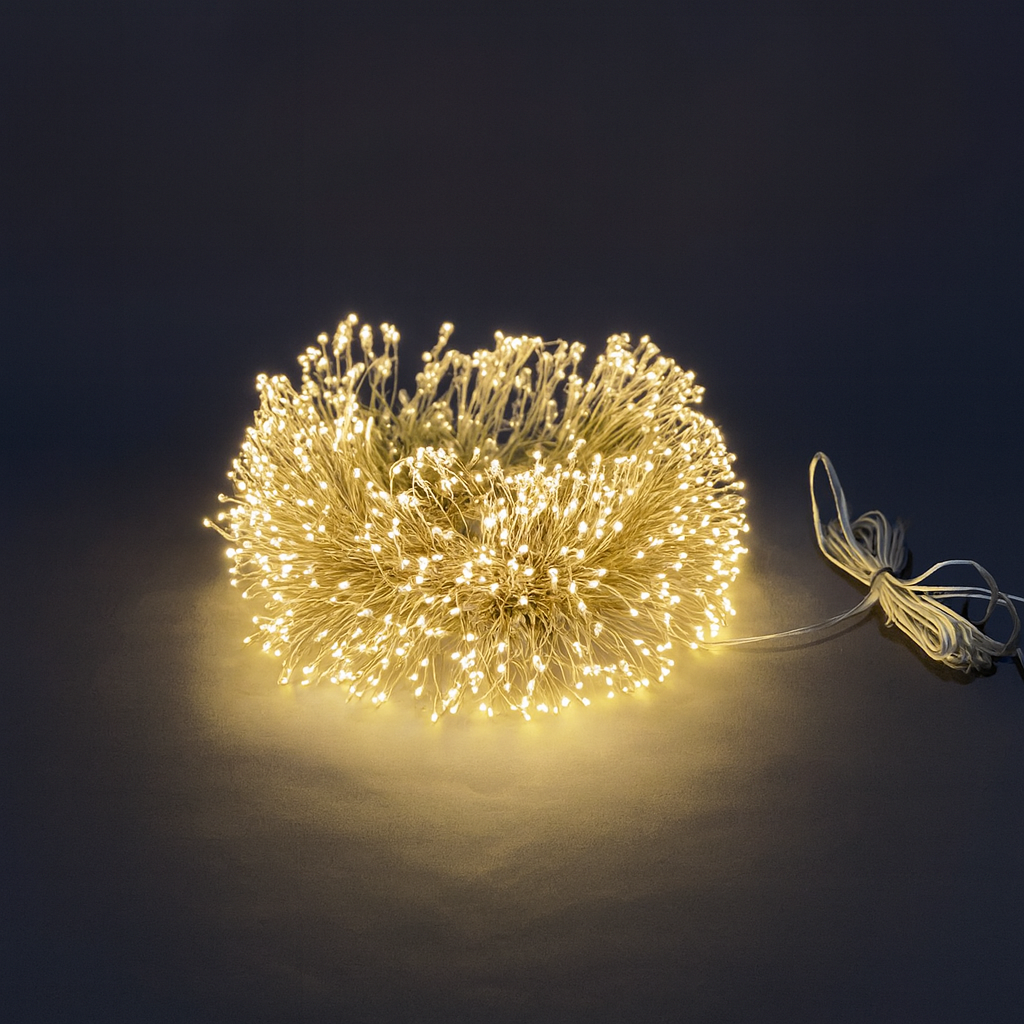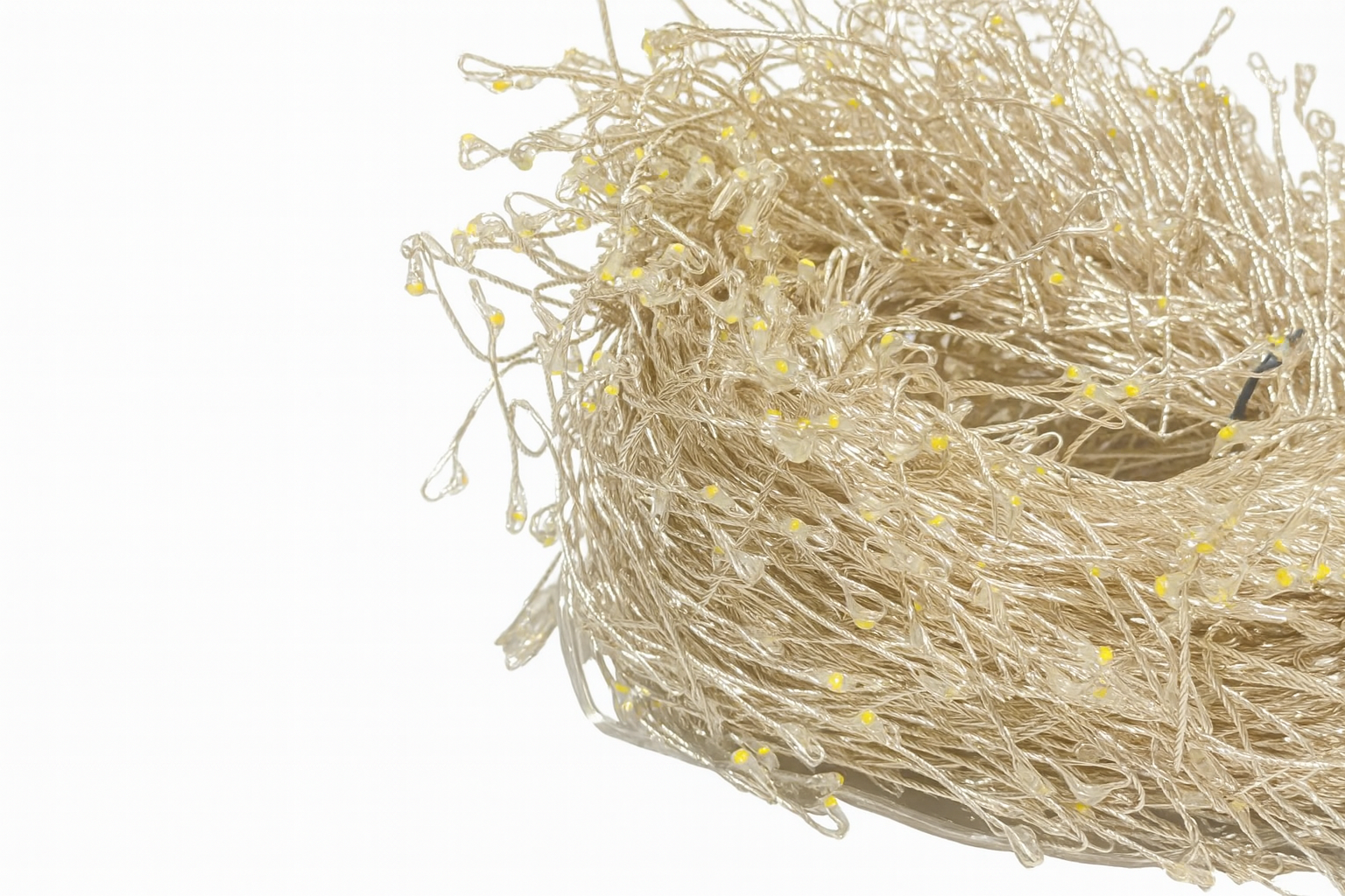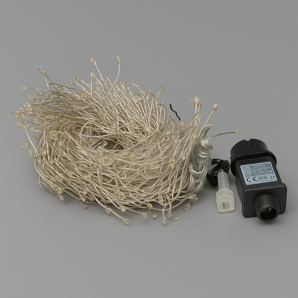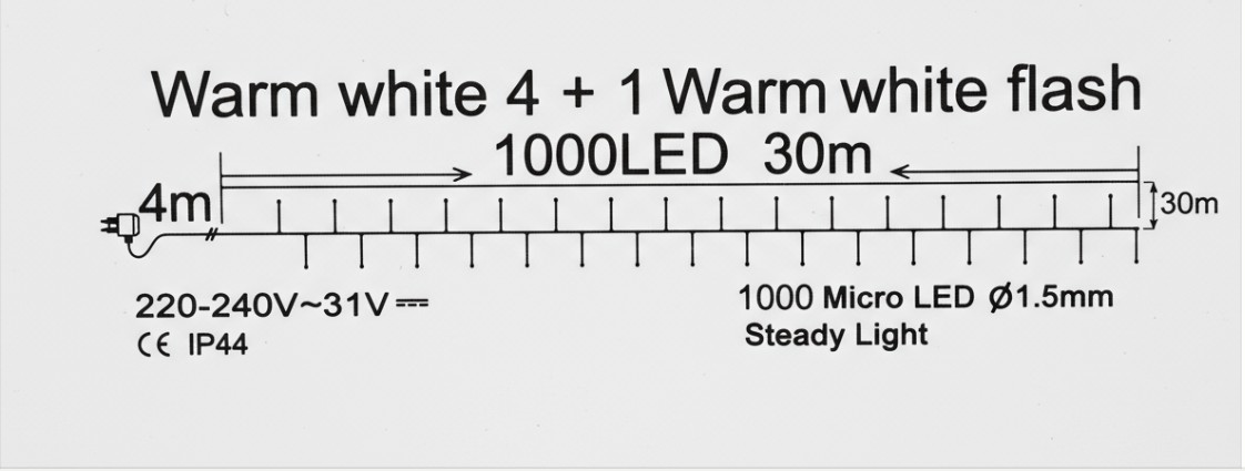Она заменит 2-3 аналогичных гирлянды. Гирлянда идет на проволоке с LED лампами — яркое и надежное украшение для дома и улицы! Работает от сети 220 В через адаптер, понижающий напряжение до безопасных 31 В. Защита IP44 гарантирует работу даже под дождём и снегом, а устойчивость к температурам от -30°С до +30°С делает её незаменимой в любых условиях. Особенность — шаг 4+1: четыре обычных светодиода и одна мерцающая лампочка создают живой, мерцающий световой эффект. Благодаря особому размещению LED ламп на отростках, отходящих от основного провода, гирлянда требует меньше длины для достижения высокой густоты и насыщенности света, что делает её особенно экономичной и эффектной. Гибкий проволочный провод позволяет легко закрепить гирлянду на ветках, фасадах и окнах. Главные плюсы: Безопасное питание через адаптер. Высокая влагозащита IP44. Надежность в холод и жару. Оригинальное мерцание одной лампочки. Большая густота и насыщенность светового эффекта при меньшей длине гирлянды. Удобный монтаж благодаря гибкому проводу.