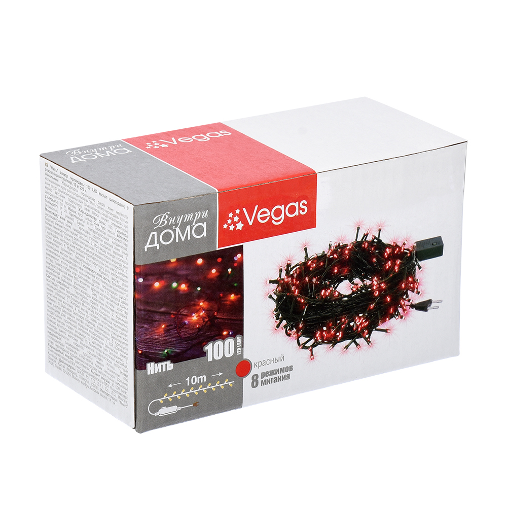 Длина гирлянды 10 м, количество светодиодов 100. Цвет свечения красный, цвет провода зеленый. Степень защиты IP 20. Мощность 6 W. Гирлянда имеет контроллер (8 режимов работы). Использовать при комнатной температуре. Срок службы 25 000 часов.