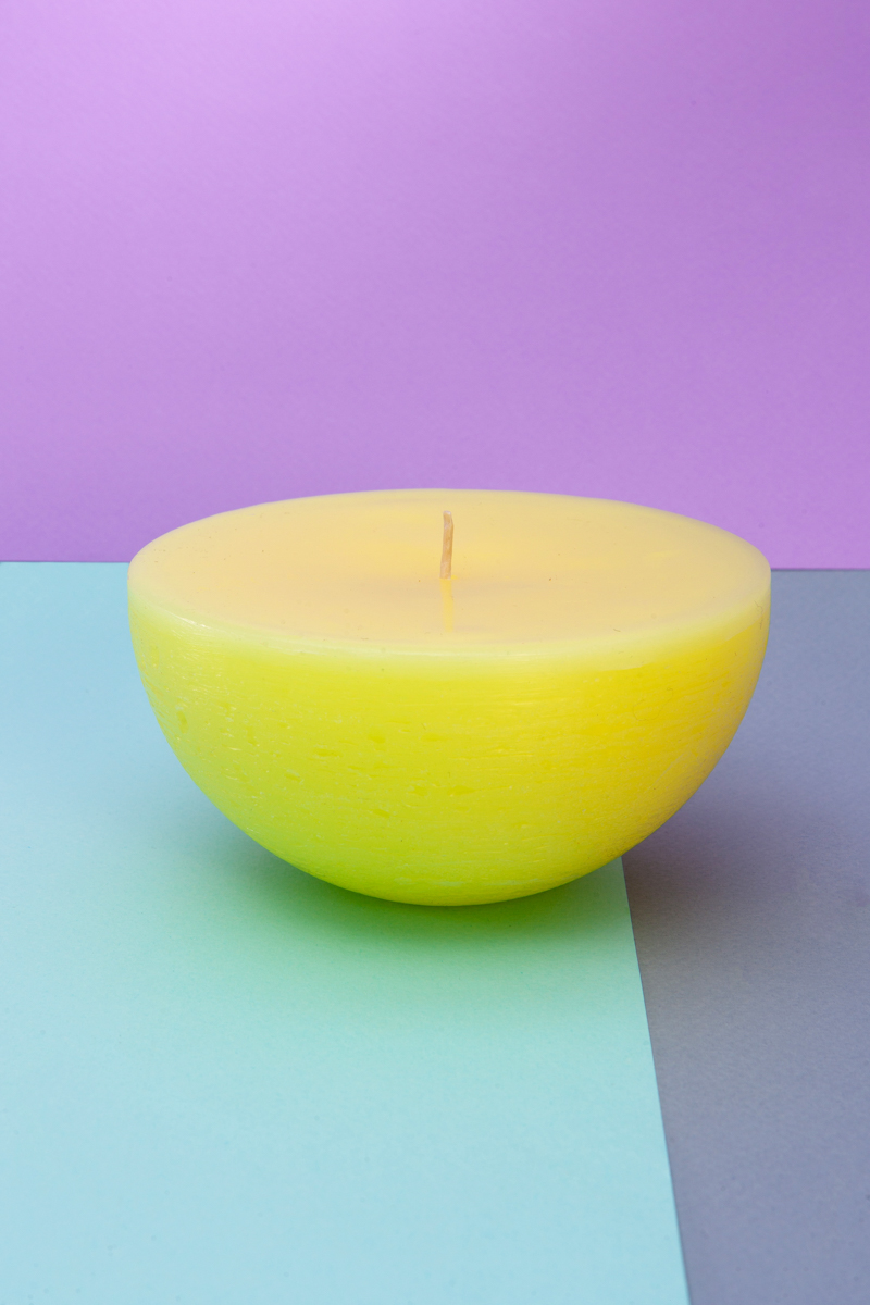 Свеча декоративная 1 шт, форма полусфера, диаметр 120. Свечи- конструктор для интерьера  ТМ Crystal Style - это яркие и необычные цвета и формы, которые выделят и украсят ваше пространство. Подойдут для любого интерьера и оформления. Их можно сочетать между собой и использовать в разных помещениях, например, в салоне красоты, при оформлении свадебных интерьеров, фотозон или дней рождений. Такая свеча станет не банальным и интересным подарком для девушки, подруги, друга, коллеги по работе . Свеча изготовлена из парафина и красителей европейского качества, без отдушек. Фитиль из натуральной хлопковой нити. Высокое качество парафина: обеспечивает длительное горение и ровное пламя, не создавая дыма или неприятного запаха. Соберите полную коллецию из серии "Лимонное счастье" из разных форм, дополните композицию свежими фруктами, тем самым, создав настроение весны, наполните интерьер яркими красками. Также хорошо сочетается с серым цветом, например , с серией "Туманное утро".