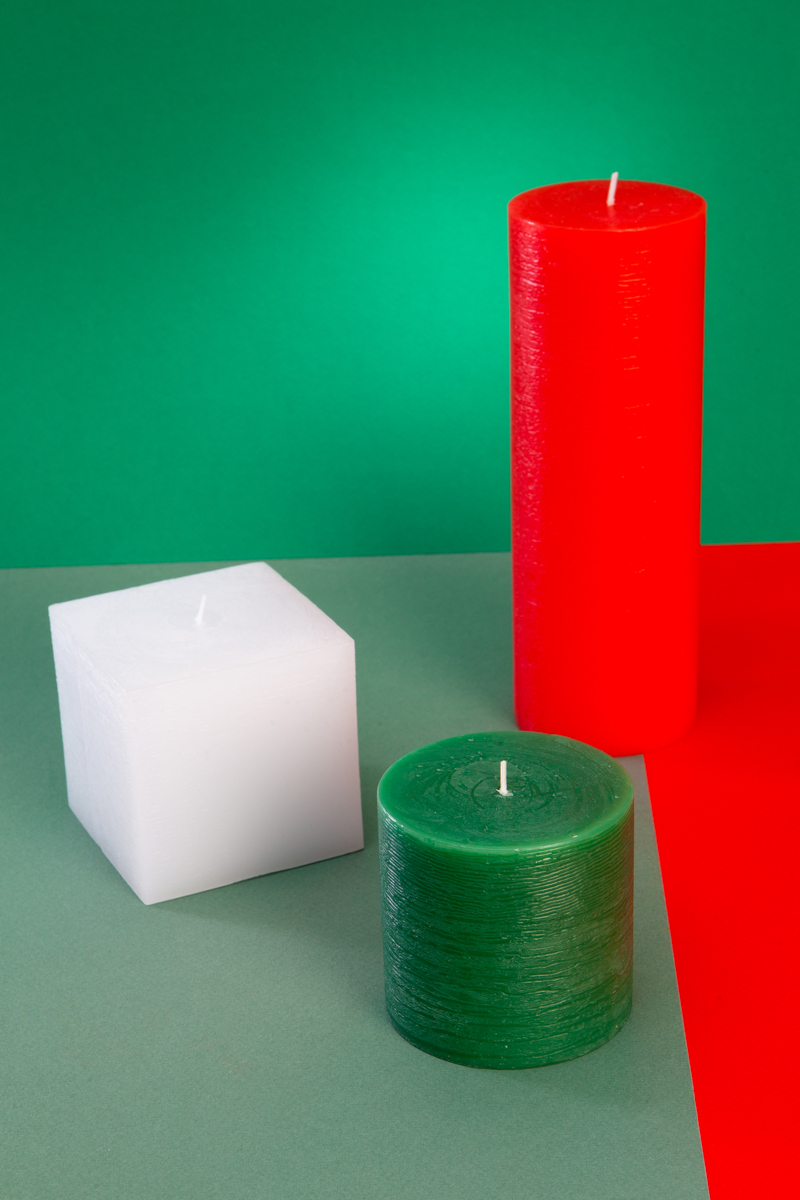 В набор входит  свечи 3 шт, красный цилиндр 1 шт, размер 6,6*19 см; белый куб 1 шт, размер  7,5*7,5 и темный зеленый цилиндр 1 шт, размер 7,3*10 см. Свечи- конструктор для интерьера  ТМ Crystal Style - это яркие и необычные цвета и формы, которые выделят и украсят ваше пространство. Подойдут для любого интерьера и оформления. Их можно сочетать между собой и использовать в разных помещениях, например, в салоне красоты, при оформлении свадебных интерьеров, фотозон или дней рождений. Такой набор станет не банальным и интересным подарком для девушки, подруги, друга, коллеги по работе . Свечи изготовлены из парафина и красителей европейского качества. Свечи без отдушек. Фитиль из натуральной хлопковой нити. Высокое качество парафина: обеспечивает длительное горение и ровное пламя, не создавая дыма или неприятного запаха. Этот набор чудесно дополнят конусные свечи из нашей коллекции "Роман с нежностью" и "Морозный день"