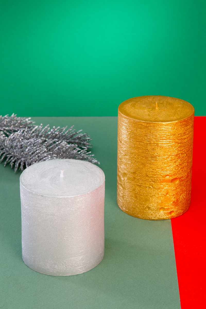 В набор входит  свечи 2 шт в форме цилиндра, серебро 1шт, размер  7,3*7,5 см и 1 шт золото, размер 7,3*10 см. Свечи- конструктор для интерьера  ТМ Crystal Style - это яркие и необычные цвета и формы, которые выделят и украсят ваше пространство. Подойдут для любого интерьера и оформления. Их можно сочетать между собой и использовать в разных помещениях, например, в салоне красоты, при оформлении свадебных интерьеров, фотозон или дней рождений. Такой набор станет не банальным и интересным подарком для девушки, подруги, друга, коллеги по работе . Свечи изготовлены из парафина и красителей европейского качества. Свечи без отдушек. Фитиль из натуральной хлопковой нити. Высокое качество парафина: обеспечивает длительное горение и ровное пламя, не создавая дыма или неприятного запаха. Создайте гармоничную композицию дополнив этот комплект свечами шар и конусными из нашей коллекции "Брызги шампанского" а также  "Ночной разговор" и "Тайны"