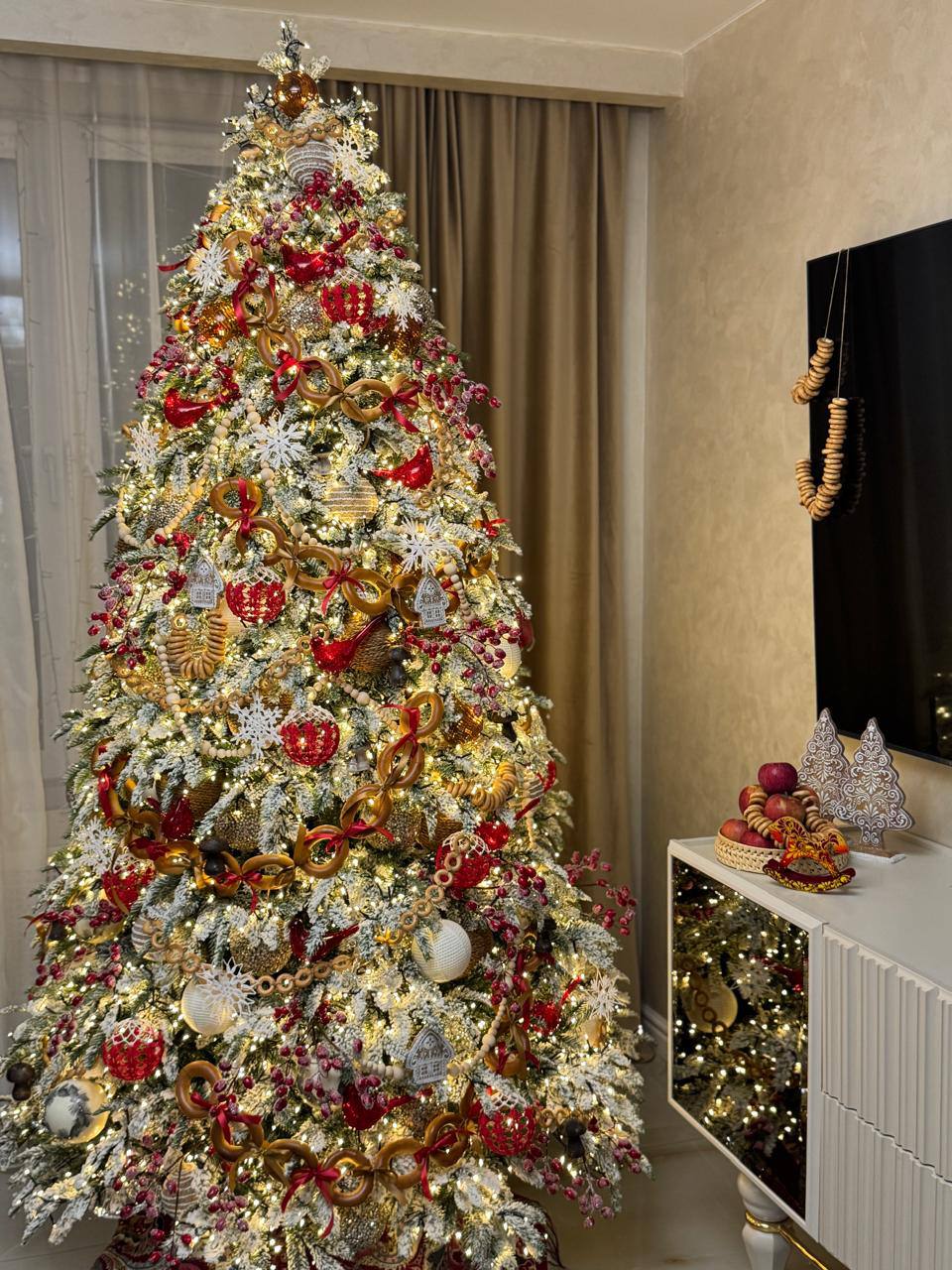 Эта роскошная широкая ель создана для больших и просторных помещений. Ее размашистые литые ветви, как отдельный вид удовольствия. Прекрасны даже без украшений и обильно припорошены снегом. Качественный,из 100% хлопка снег не осыпается и не доставит вам хлопот, а только радостные ассоциации.